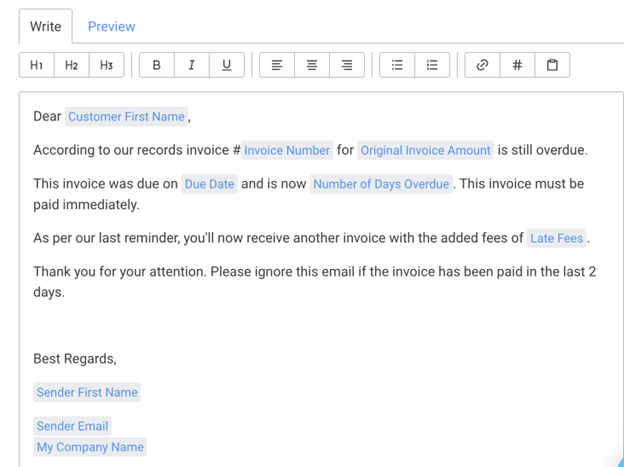 b. Set up multiple invoice reminders. At one of the later reminders, add in a sentence that warns the customer that you will charge late payment fees if they don’t pay.