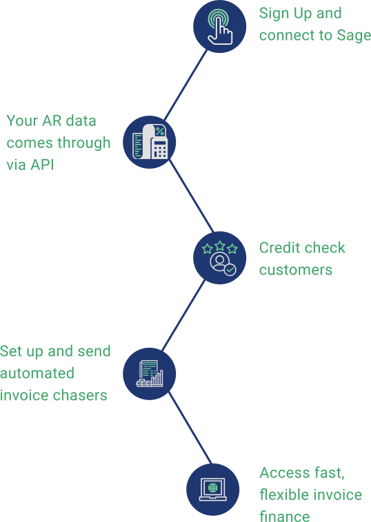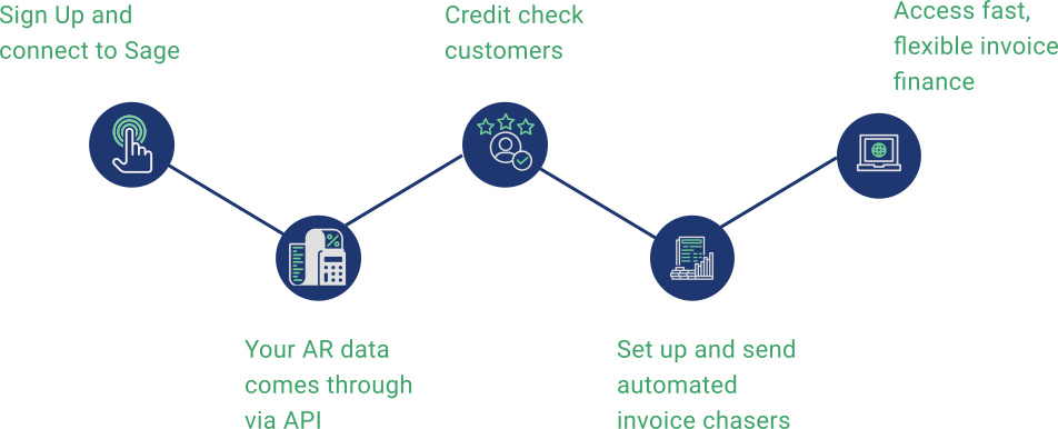 Satago integrates with Sage in a few clicks to fully automate your accounts receivable process and flag invoices eligible for financing.