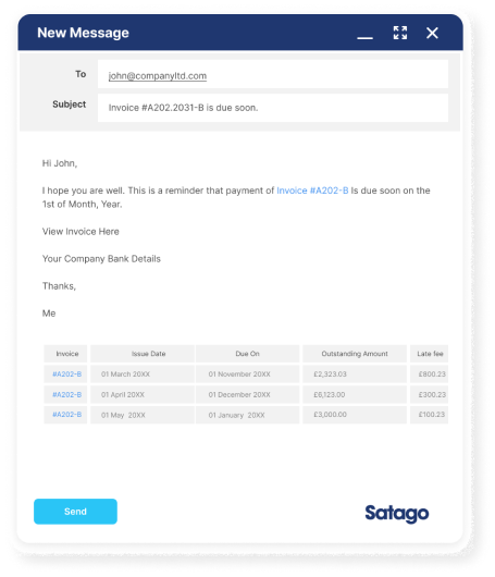If you want to charge late fees on overdue invoices, Satago will automatically calculate the fees in line with statutory limits and add them to your payment reminders when an invoice becomes overdue.