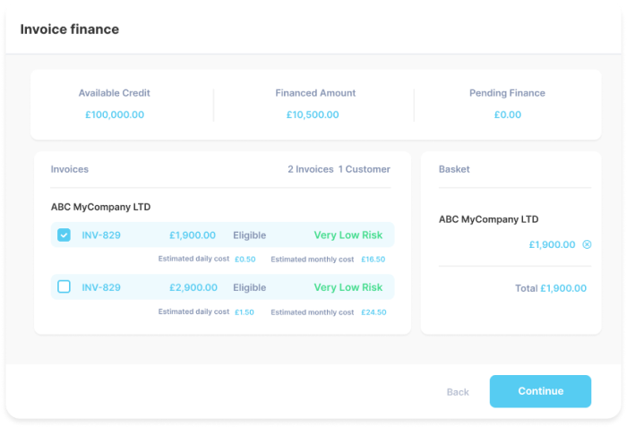 Work to your own timelines and finance selected or all outstanding invoices at once, with transparent pricing and no minimum commitment.