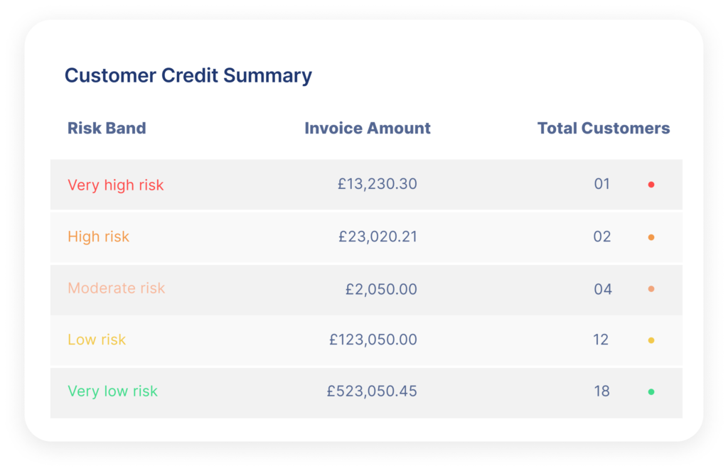 With Satago’s risk analysis tool, you’re in the driving seat. View all your debtor data in one dashboard. Monitor how likely they are to pay you on time, based on variables including credit score and previous payment history, to truly understand who you’re working with.